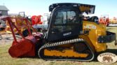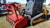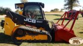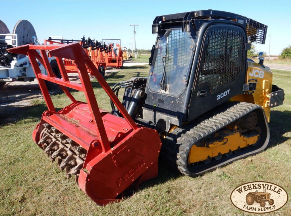 2013 JCB 300T tracked skid steer loader with 2,210 hours. Powered by a 4-cylinder diesel engine and hydrostatic transmission with two-speed travel. Features an enclosed cab with AC/heat, hand-operated bucket control, pattern changer, and electronic monitoring system. Equipped with auxiliary hydraulics, auxiliary electrical outlet, manual quick coupler, hydraulic winch, and Fecon forestry mulcher with a 5′ cutting width. Runs on 18″ wide tracks for enhanced stability.
